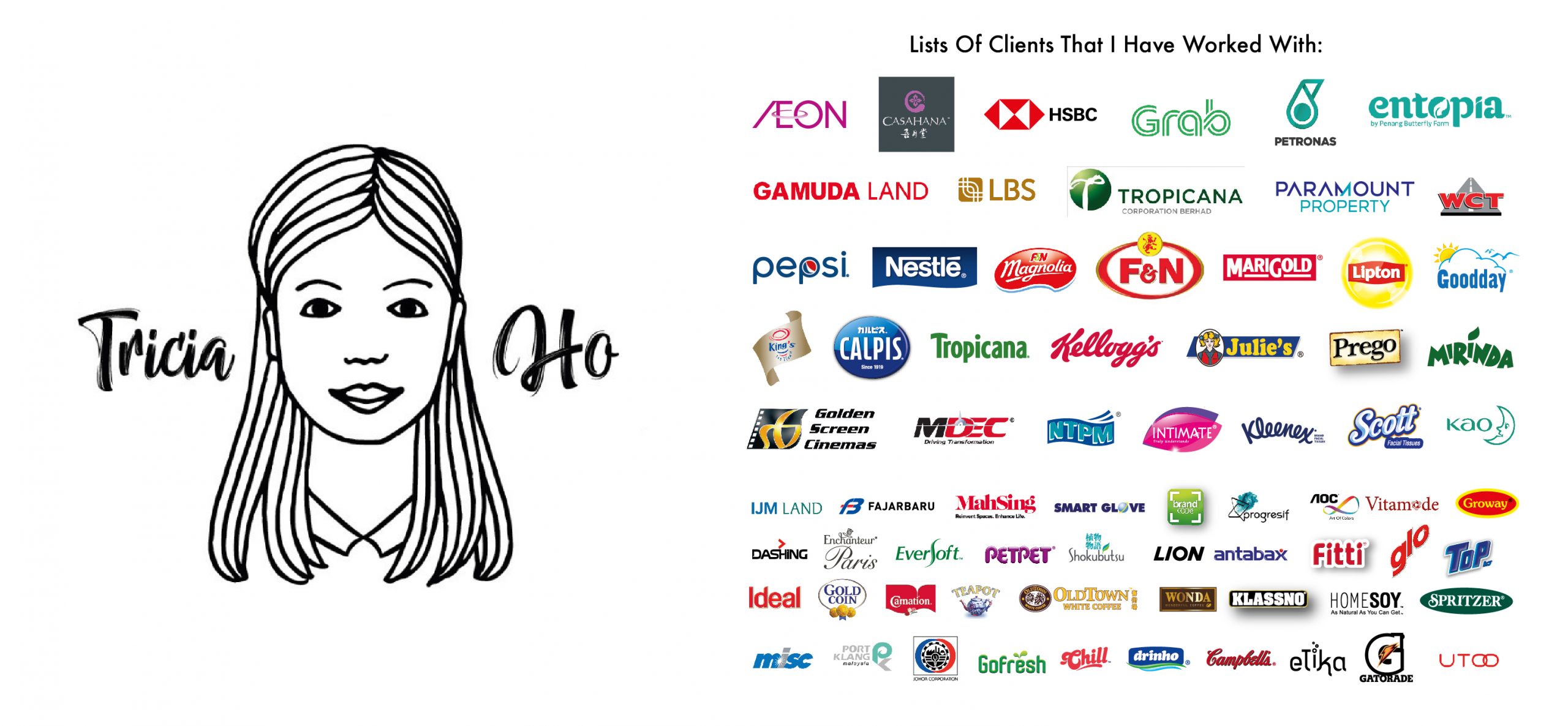 Clients that I worked before with: Casahana, Golden Screen Cinema, UTOO, AOC, Phillips, PETRONAS, Progresif (Telco in Brunei), Entopia (previously known as Penang Butterfly Farm), Tapestree (Restaurant in Entopia), F&N Dairies, Sime Darby Plantation, Malaysia Digital Economy Corporation (MDEC), GRAB, IJMLand, Ibrahim International Business District (IIBD), Vitamode, DSG (such as PETPET, Fitti, Certainty), Kellogg’s, Spritzer, PepsiCo, Etika/Permanis (Calpis, Goodday, Wonda), UNZA (Aiken, Dashing, Romano, Eversoft, Enchanteur), SC Johnson, Nestle, Mead Johnson, Lamsoon (Antabax), Kimberly Clark (Kleenex, Scott, Huggies), NTPM, HSBC, Gamuda Land, LBS, Tropicana, Mah Sing, WCT, AEON, Groway, and etc.
